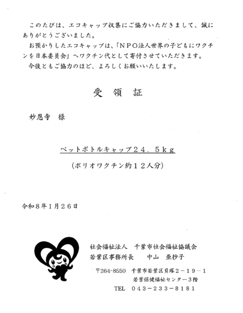 2026年1月30日 / 最終更新日時 : 2026年1月30日 myouonji ご案内 エコキャップ収集ご協力の御礼 皆さまより収集したエコキャップをワクチン代として寄付致しました。 ご協力ありがとうございました。 引き続き妙恩寺正面入り口に『回収BOX』を設置致しておりますので、 今後ともご協力の程、宜しくお願い致します。